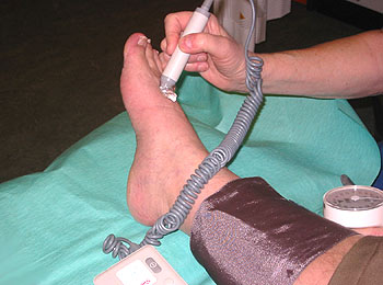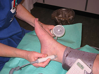 Med en lille hånddoppler kan man måle et ankelsystolisk blodtryk. Tåsystolisk blodtryk kan ikke måles ved denne metode.